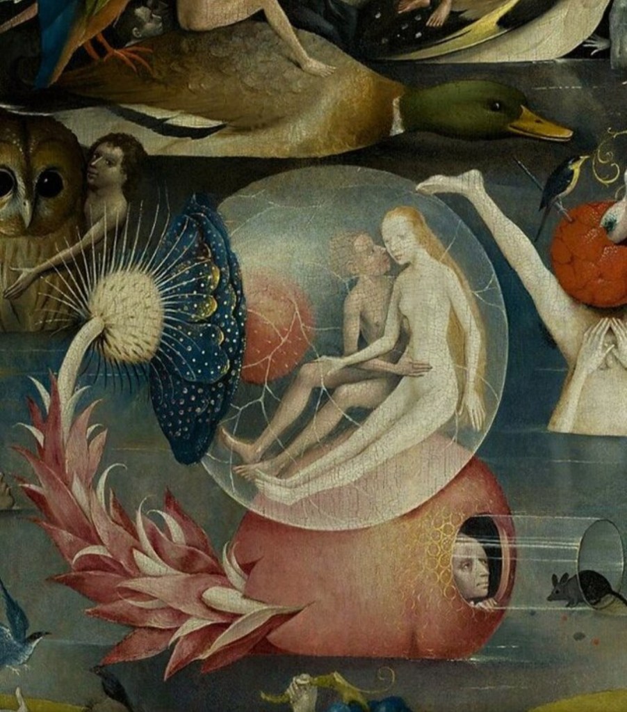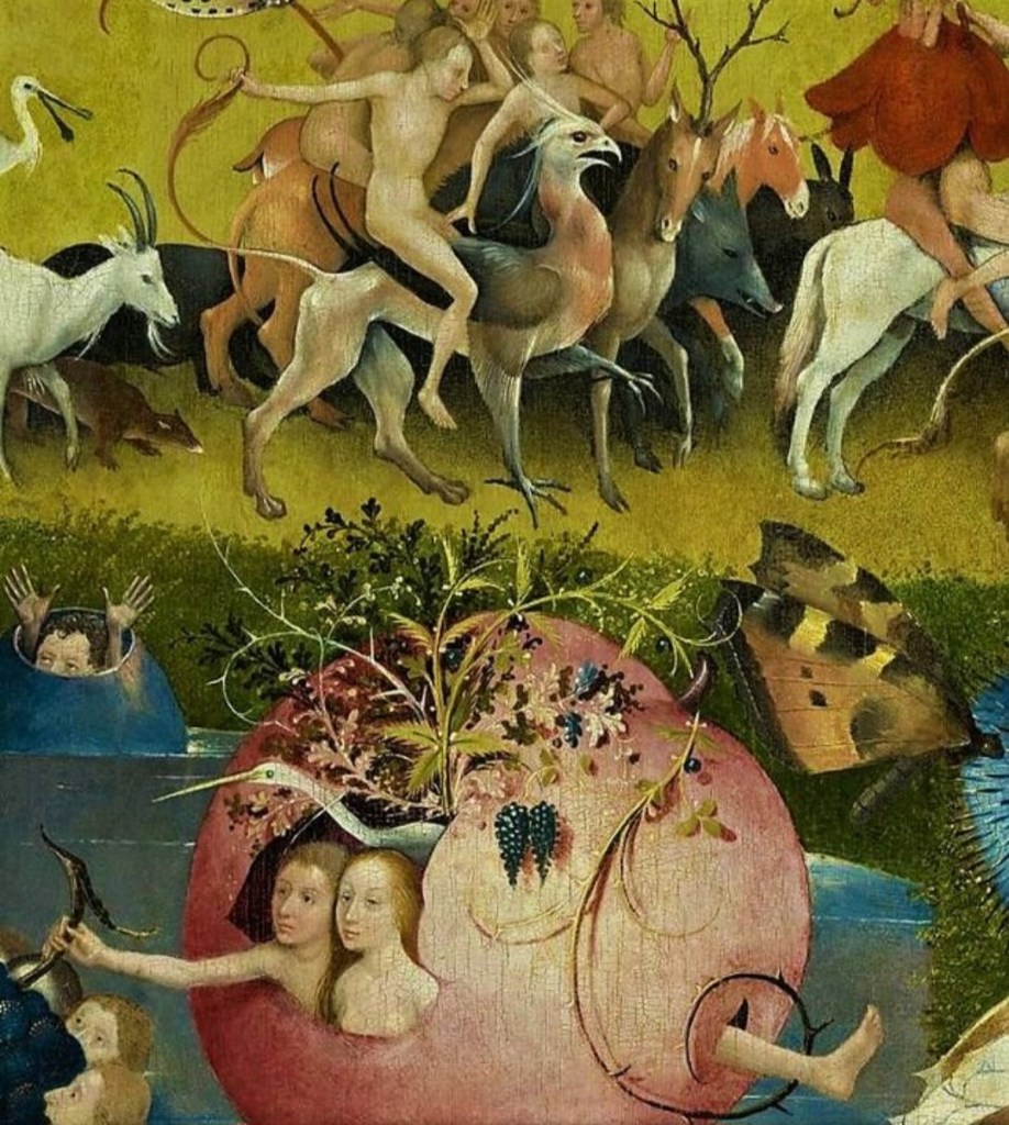 В этом отношении даже более интересен «Сад земных наслаждений» Иеронима Босха. Немного мешает осуждение, которое должны вызывают отдельные сцены, и не помогает понять, почему же так вообще происходит, почему у него человечки с безумными лицами? Как он это видит? Если подумать, что большинство людей на нашей планете много-много понимают, понимают, что человек по природе своей нуждается в разумных ограничениях, во всяком случае многие хотели бы ограничить других, но это понимание ни чем не помогает. Как будто это цветочные человечки безумные, а люди умные, но их ум не управляет телом. Телом управляет цветочный человечек. Если бы душа была ребёнком, или эльфом, жила на каком то растении в окружении других душ, но вынуждена была делать все наши необходимые дела, не имея при этом разума? Душа не подвластна греху, она тонко реагирует, даёт знать о себе, с ней что-то происходит, она капризничает, бунтует, заболевает. Может, мы не знает какие события происходят в мире цветочных человечков. Тоже самое «Ад» Данте, в котором не души умерших, а души живущих, в них тоже есть что-то механическое, то что им мешает, они что-то знают о своей личности, но ум в их мире не действует. Я вижу в этом нарушенную целостность, которую можно восстановить. При этом загадка двойственности нашей личности должна оберегаться. Её нужно оберегать от физиков и математиков, которые хотят всё доказать и просчитать. Если бы существовала некая железная дорога в потустороннем мире, такая, по которой Гарри Поттер путешествовал в Хогвартс и обратно. Что, если мы можем этой дорогой пользоваться? Если она уже есть, нам не нужно её строить, всё для нас уже сделано, нам нужно только научиться ей пользоваться. Зачем тогда нужны эти расчеты и вычисления? Людям нужно перенять образ жизни в соответствии с гармонией, меньше заниматься физикой и математикой, найти свой личный творческий источник, которым даже не надо будет ни с кем делиться.